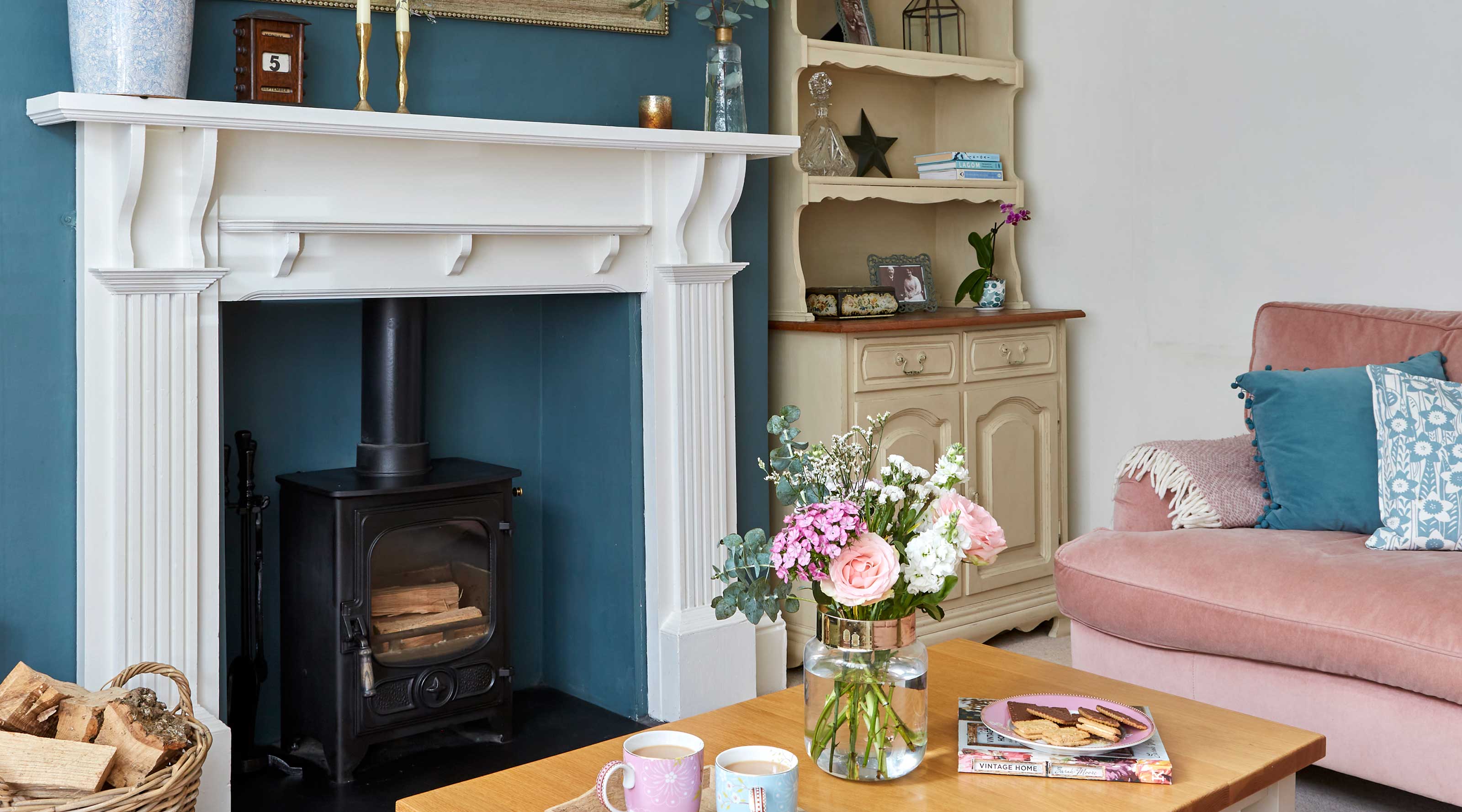 They added a wood burner and new hearth as a living room fireplace idea, and a painted dresser that she found secondhand on eBay, fits snugly in one of the alcoves.