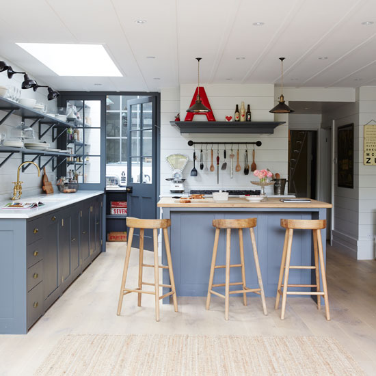 Blue Shaker units, open shelves and an island unit give this large kitchen a distinctive Hamptons vibe when set against a white wood panelled backdrop. The timber keeps the room warm and inviting while pale wood flooring is open and laid-back. Pops of red on the industrial style shelves give the room the vintage flair that Americana is all about and the beautiful softly rounded bar stools are timeless and Amish in style.