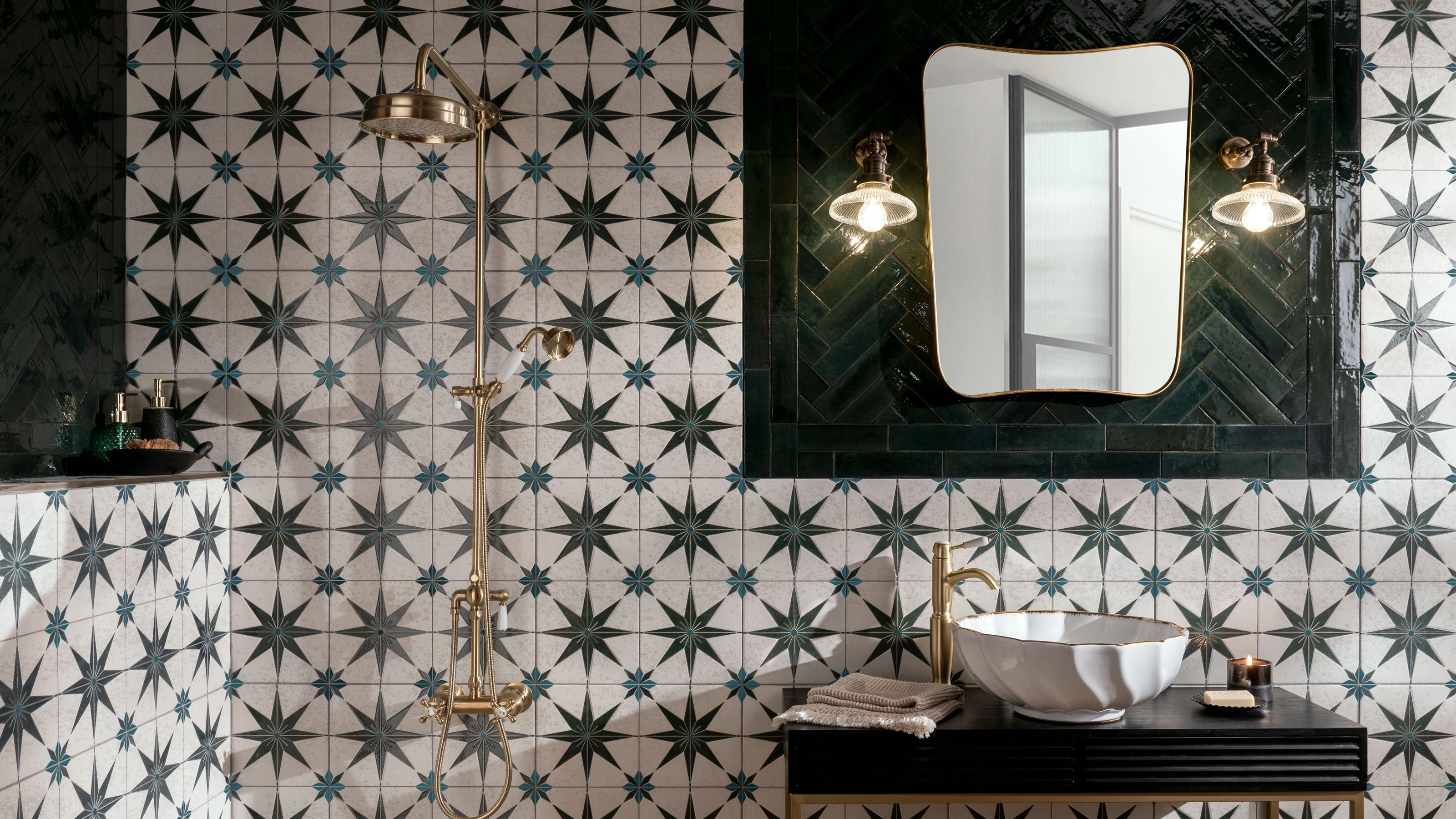 Tile drenching is a huge trend at the moment, and it can look incredibly effective when done with a statement tile like Statements Capello in forest green. However, the secret to this look's success is the pairing with a green rectangular tile, which creates a focal point around the mirror.