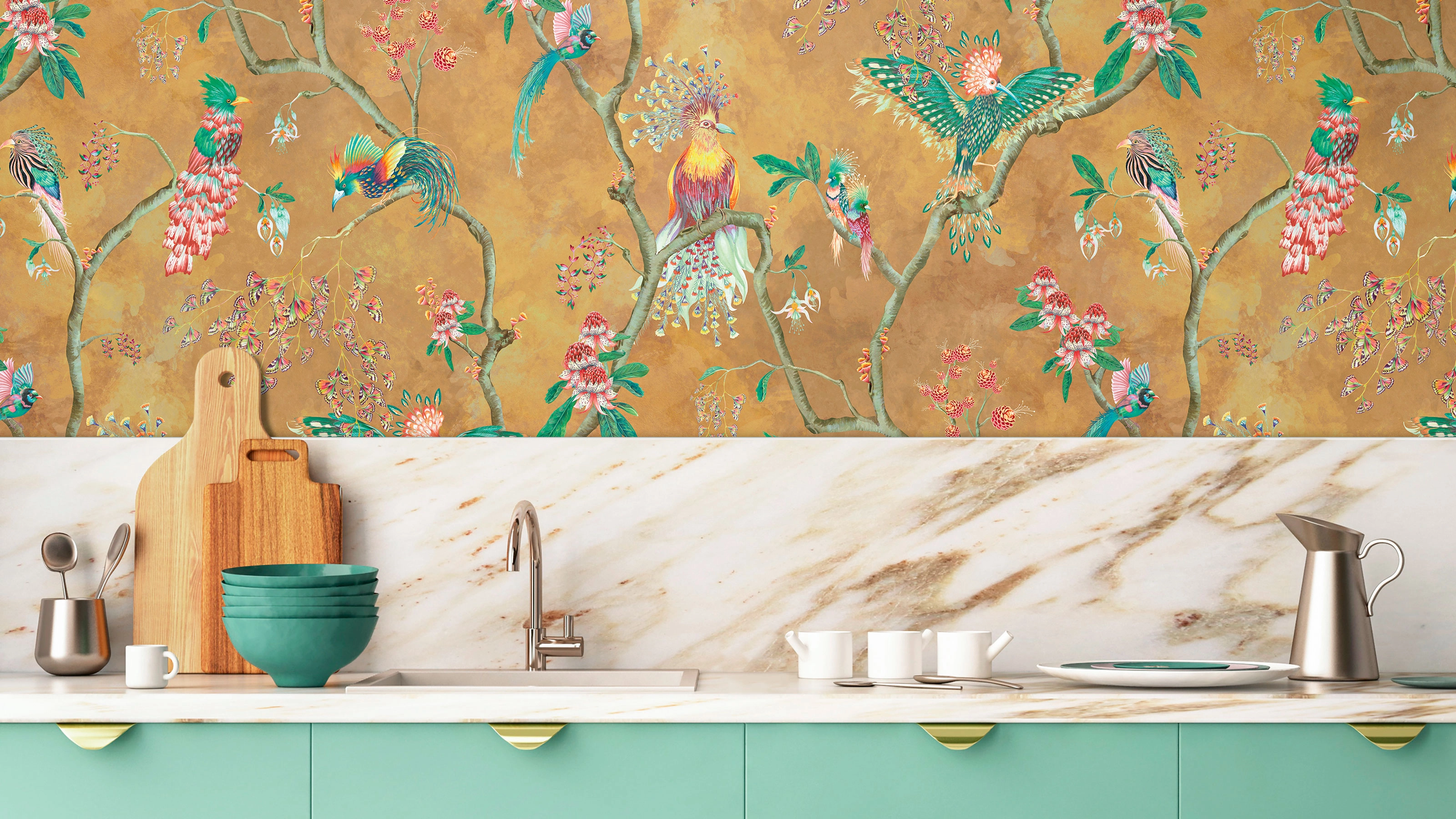 Contrast traditional decorative wallpapers and fabrics with contemporary-style furniture to keep the look fresh, rather than fussy. Let one hero pattern take centre stage, then introduce bold blocks of coordinating colours with statement upholstery or sleek cabinetry.