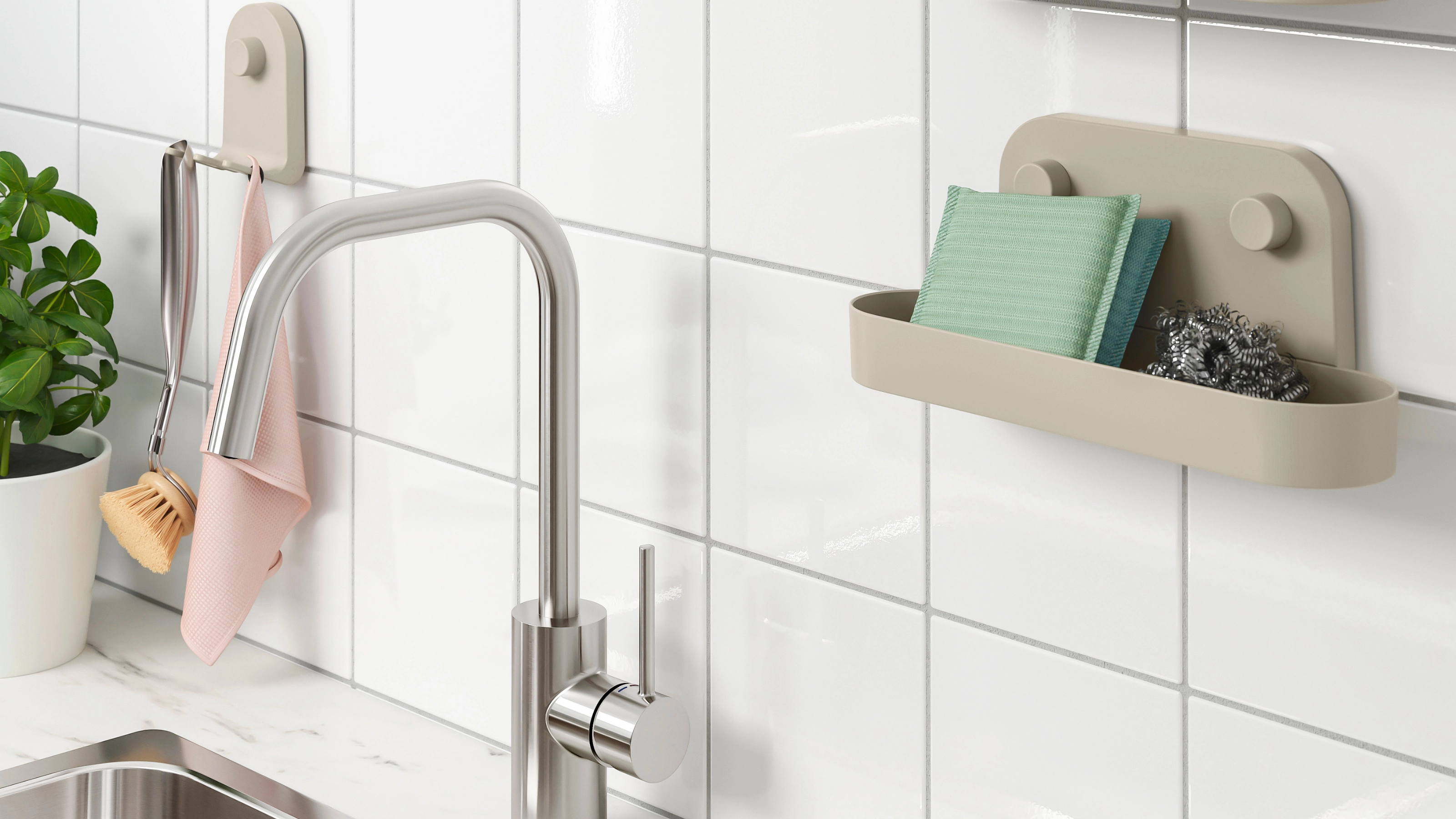 Also perfect for practical bathroom storage, the ÖBONÄS shelving collection uses suction cups to fix onto your kitchen tiles, providing vertical kitchen storage ideas for your home.