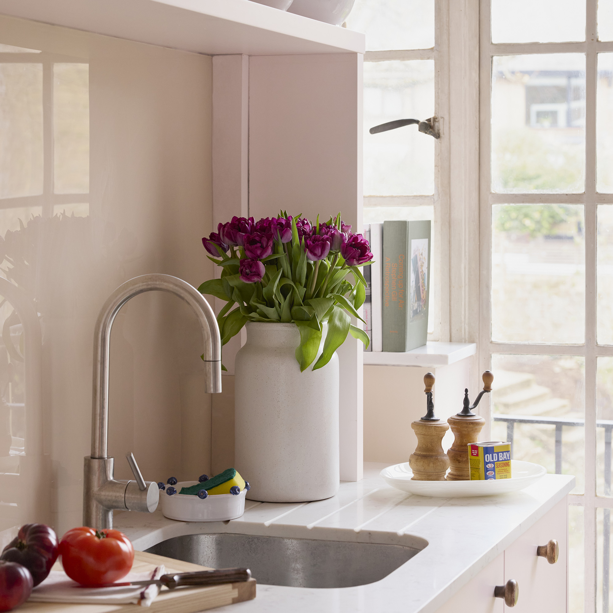 Utilising awkward spaces for ledges to prop books on or adding a small table for a plant and fruit bowl will make your kitchen feel like a home and won't take up precious worktop space. This homeowner also shows how it's possible to keep items on your surfaces too - by keeping cooking essentials contained in a basket or tray, it makes it easy to move around when needed and prevents clutter from building up.