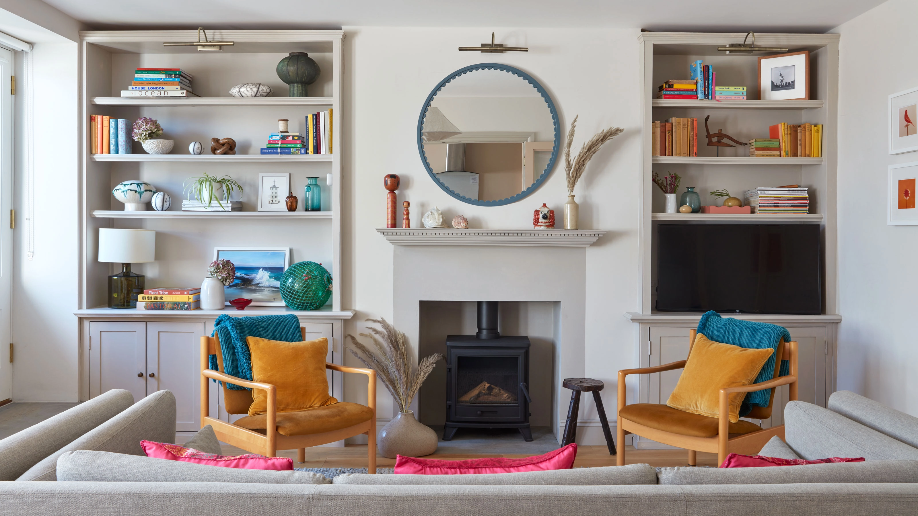 Styling shelves, adding artwork, or incorporating softer materials like wood and textiles can help shift the focus away from screens and create a living room that feels more inviting and less tech-led.