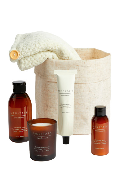 This elegant bathroom set contains a soft hair turban, together with a hand cream, body wash, body lotion and a candle, all infused with essential oils of black pepper, mandarin, cypress and cedarwood.