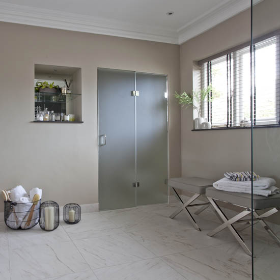 Smart grey Venetian blinds give the windows a streamlined finish. While the wasted space under the window is put to good use with a pair of sleek footstools for a spa-like feel.