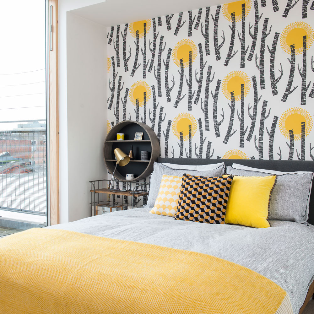 Allow your feature wall to stand out but seamlessly tie in with the rest of the decor, to master an effortlessly well-thought-out decor. If using a patterned wallpaper to create your feature wall, select a key colour to play prominence within the rest of the room. Here yellow brings a sunny disposition to an otherwise monochrome look.