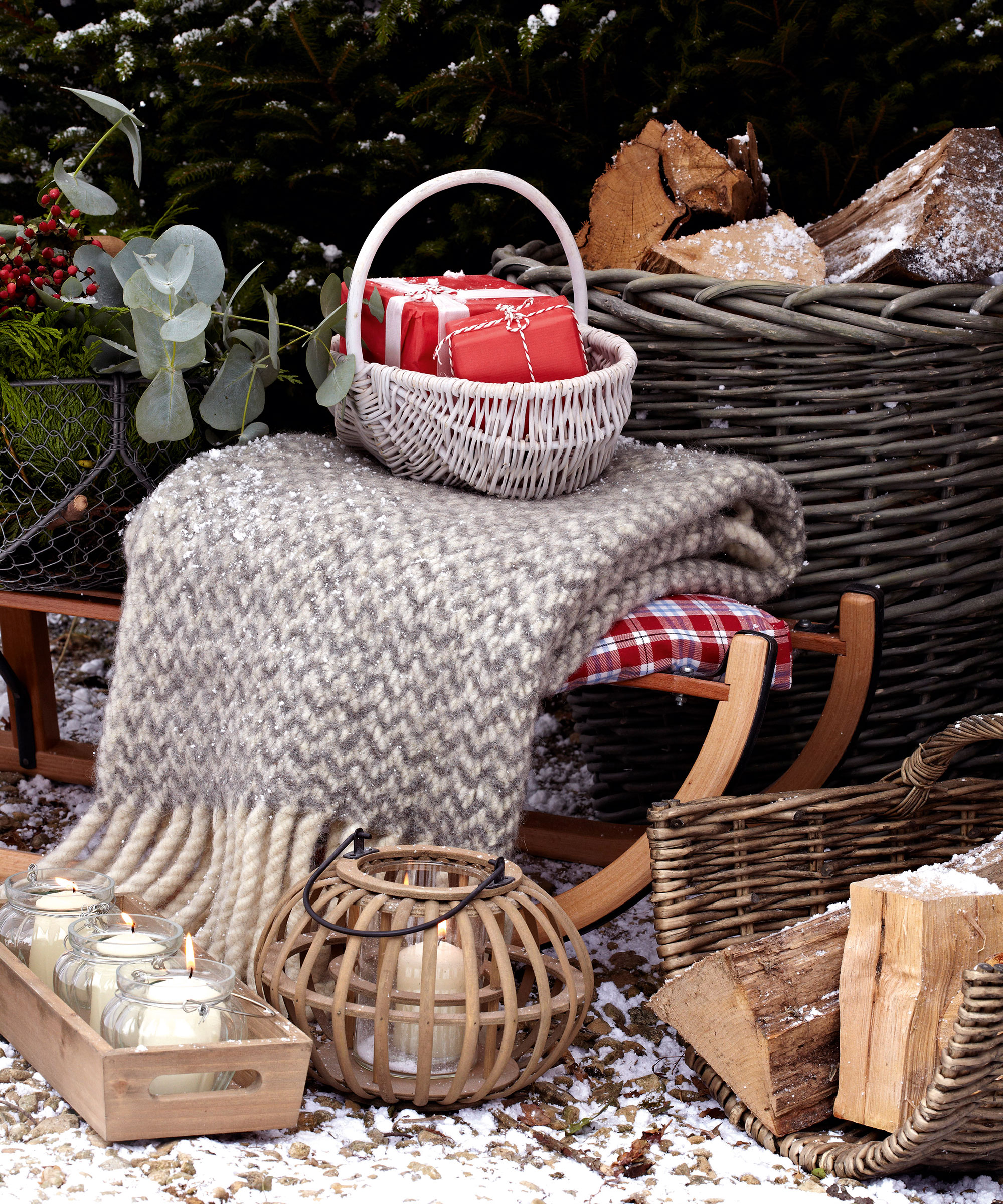 Baskets laden with logs and chopped up wood, jars filled with candles, and woven trugs packed with wrapped gifts all make a stylish setting. A traditional sleigh, like this whitewashed wooden sleigh, £21.99, Amazon, layered with cosy blankets means they're at hand for keeping toasty.