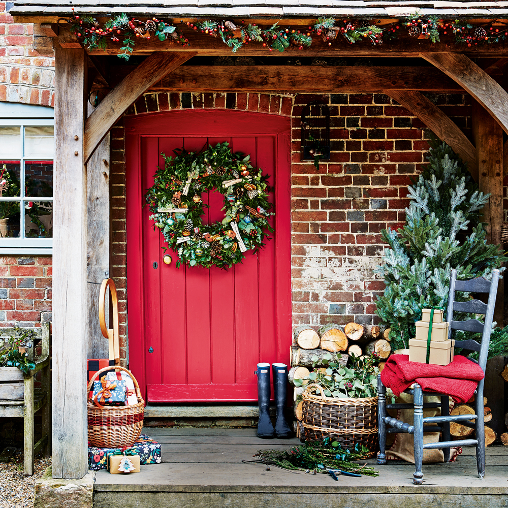 Use evergreen shrubs and a classic door wreath to give the entrance to your home a festive makeover. A pair of urns and two standard shrubs form a symmetrical frame around the front door, making this property feel extra special at Christmas. A porch is the perfect place for storing walking boots and firewood, adding an extra rustic edge.