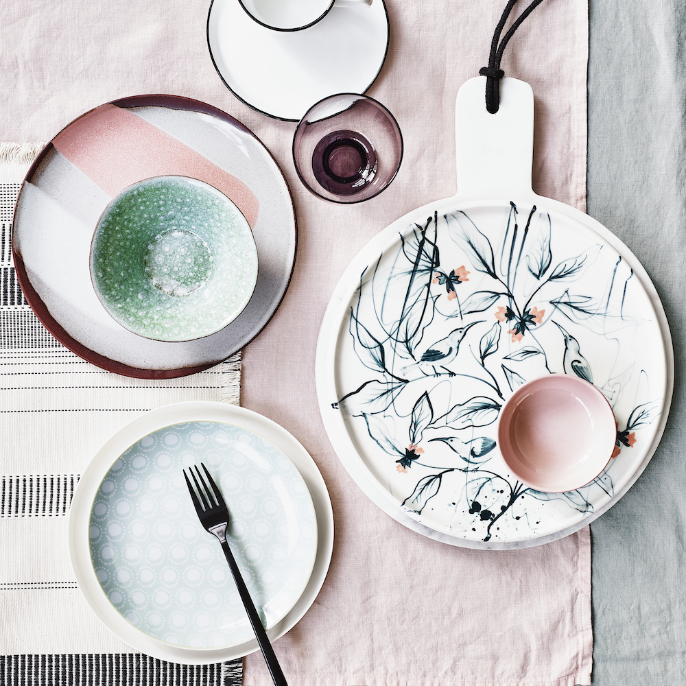 Update your table with new colours and textures for spring. For an easy, relaxed look, choose a mix of patterns in a pastel palette of pale green, blue and blush pink. Look for designs that will work well together - a spot with a stripe, a floral with a plain for example.