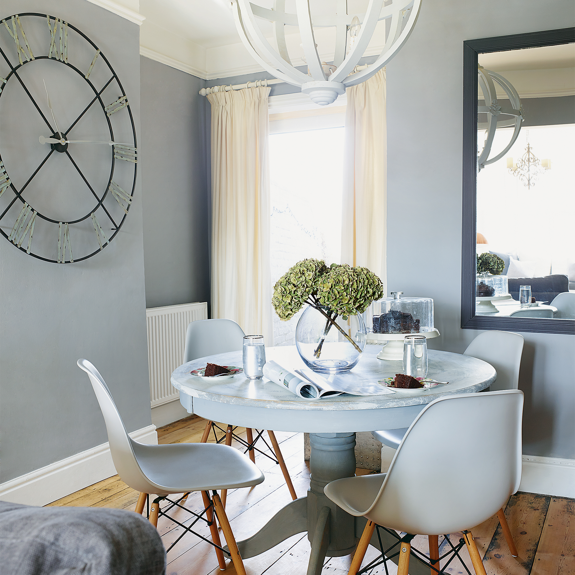 Look for interesting detail to give a white mirror hung against a white painted wall impact. A French-style mirror, with raised detailing, echoes the style of the painted dining table and dining chairs.