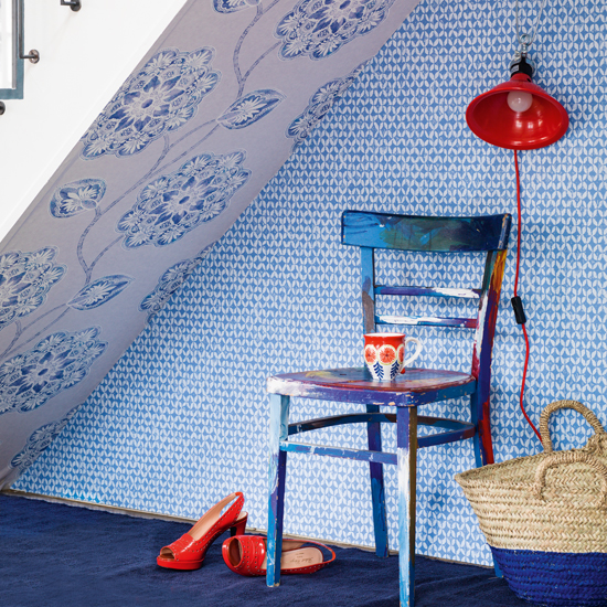 Understairs papered in Mumtaz by Osborne & Little. Walls lined with Shri by Harlequin. Chair painted in selected paints from Dulux.