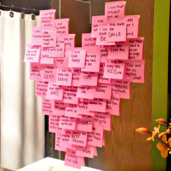 Jot down some love notes and romantic words on a few post-it notes and cluster them in the shape of a heart around the house. Try the bathroom, the bedroom, the fridge and even the car.