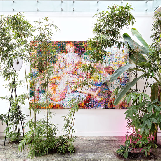This internal courtyard has a glazed roof, so growing exotic palms and foliage here is a breeze. As a thoroughfare through the house, it makes a calm, soothing contrast to all the frenetic activity that goes on elsewhere. That eclectic piece of art is also positioned to help you pause and linger... After all, gardens - even indoor ones - are places where you should while away as much time as you can...