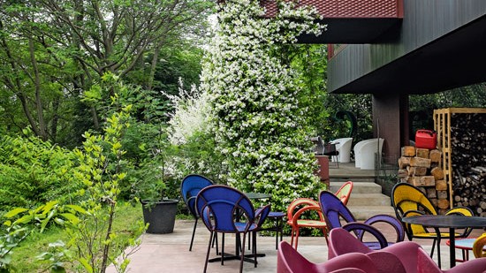 Many of us have bay windows in our homes, but have you ever seen such a gorgeous design as this? The double doors and large panelled windows let light stream into the house, while the tall verdant plants and trees mimic the foliage growing on the terrace outside. The upcycled chairs and sleek table create a contemporary twist to the classic bistro look - urban chic with a rustic feel.