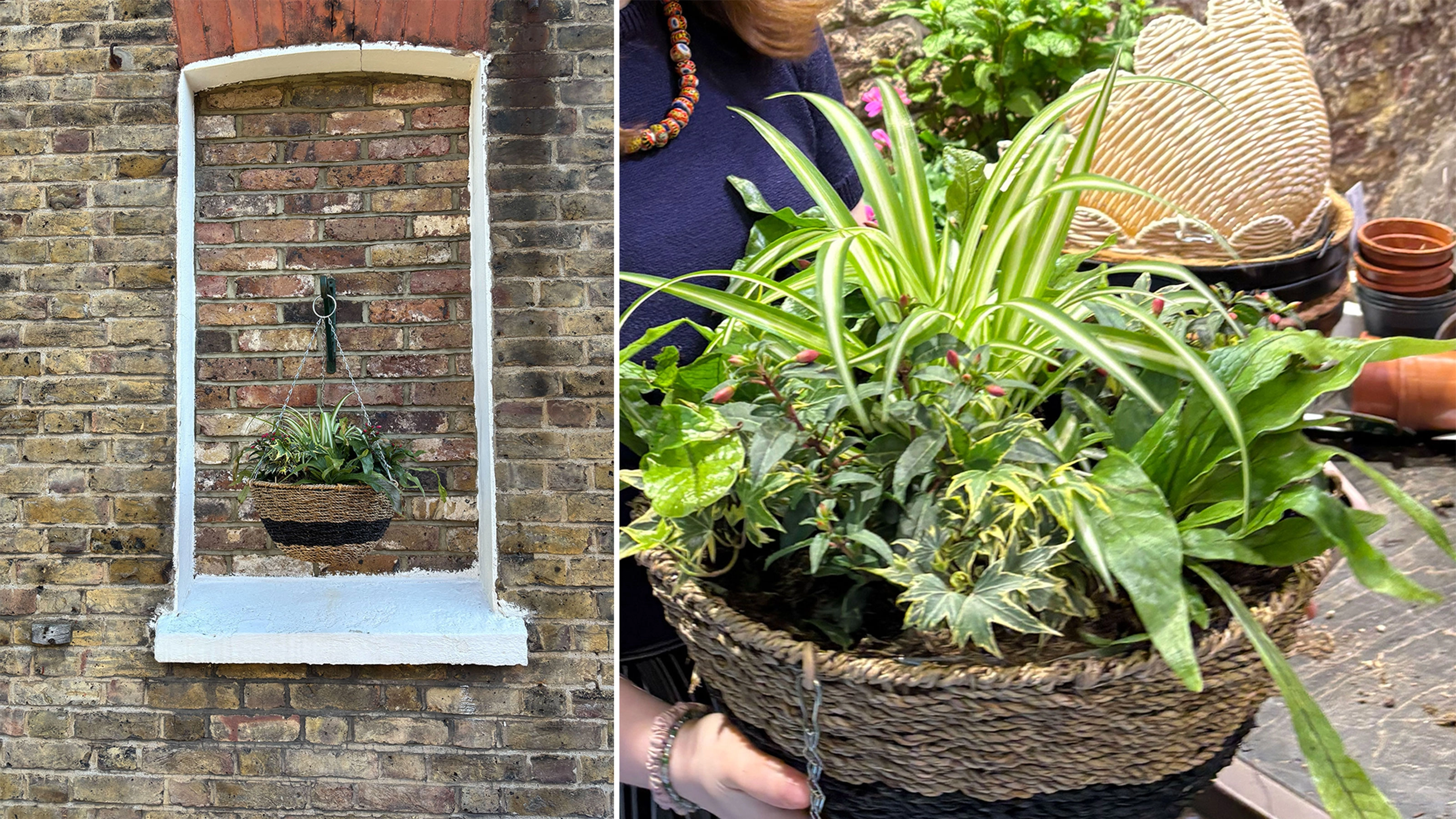 'Ensuring good drainage and regular feeding will also support healthy growth, as shaded baskets can retain more moisture,' explained Duncan, who poked three holes in the lining of the £13 B&Q rattan hanging basket before adding compost.
