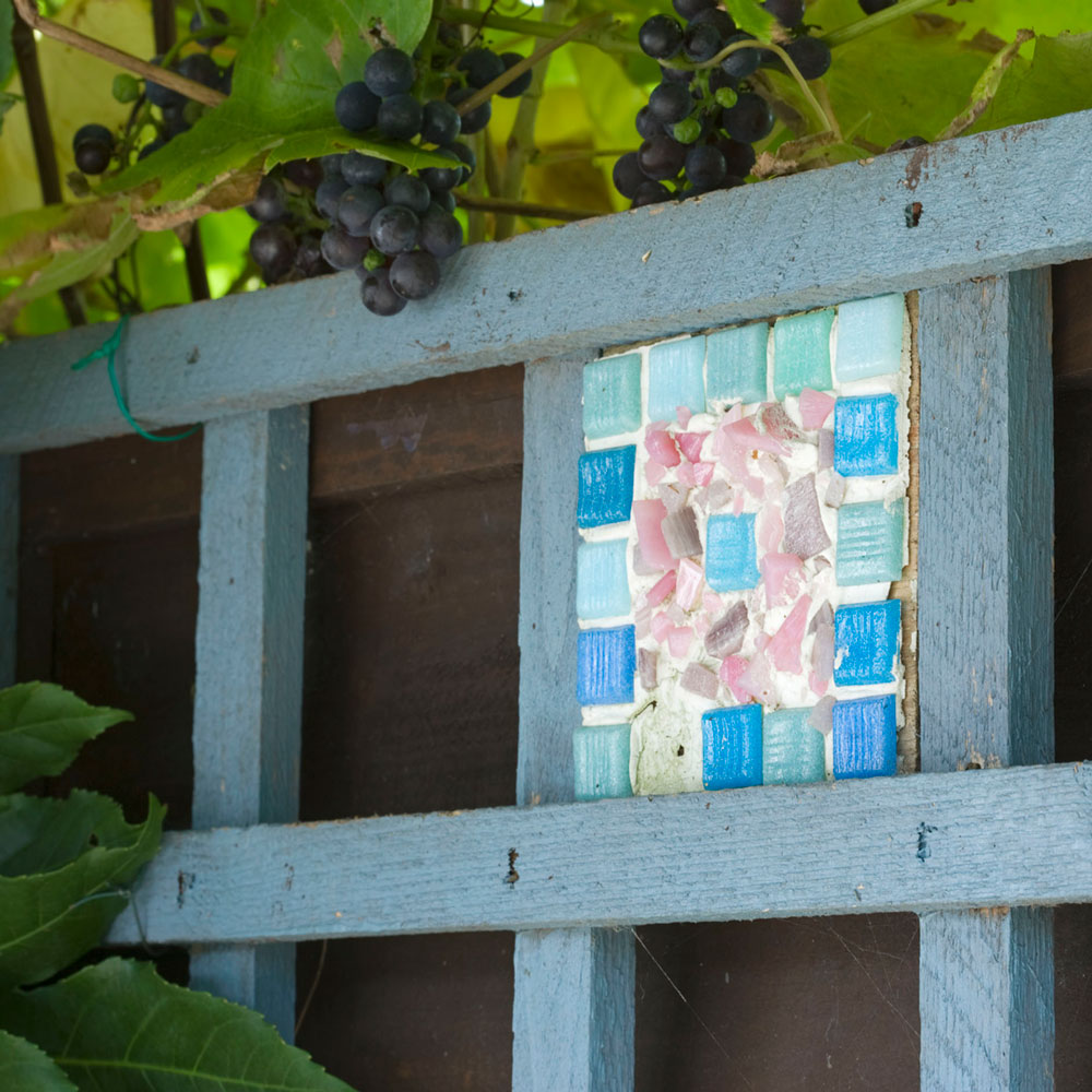 One-off tiles placed randomly in the trellis squares create a truly unique look. Fix the trellis so that is secure enough against wind, but also make sure it is will be easy to remove once fence-painting time comes around.
