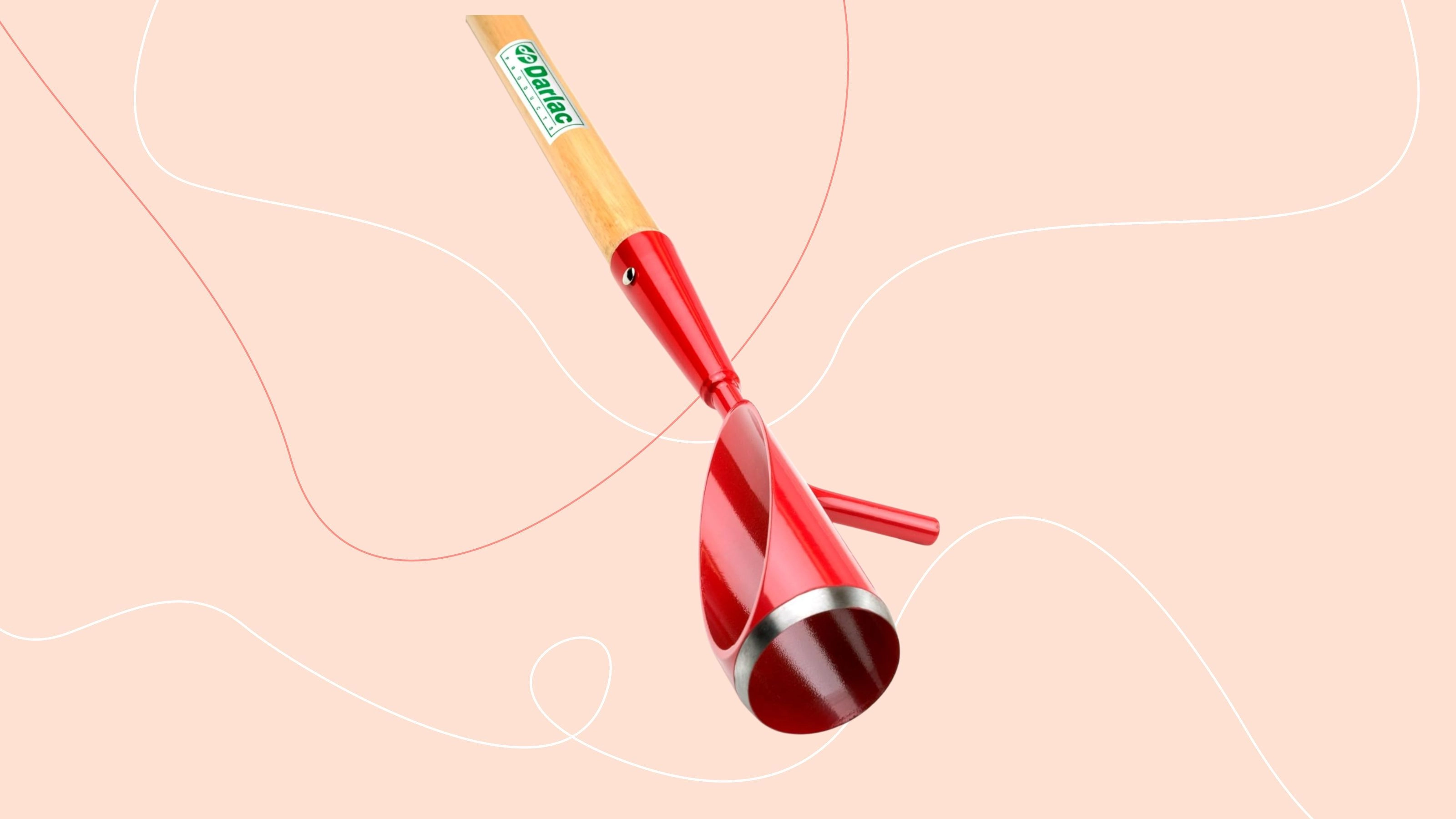 The bulb-planting part of the tool has a cheery red outer coating with a sharp carbon steel cutting head at the bottom that slices through the soil to remove a plug of earth, leaving a 6cm wide x 10cm deep hole.