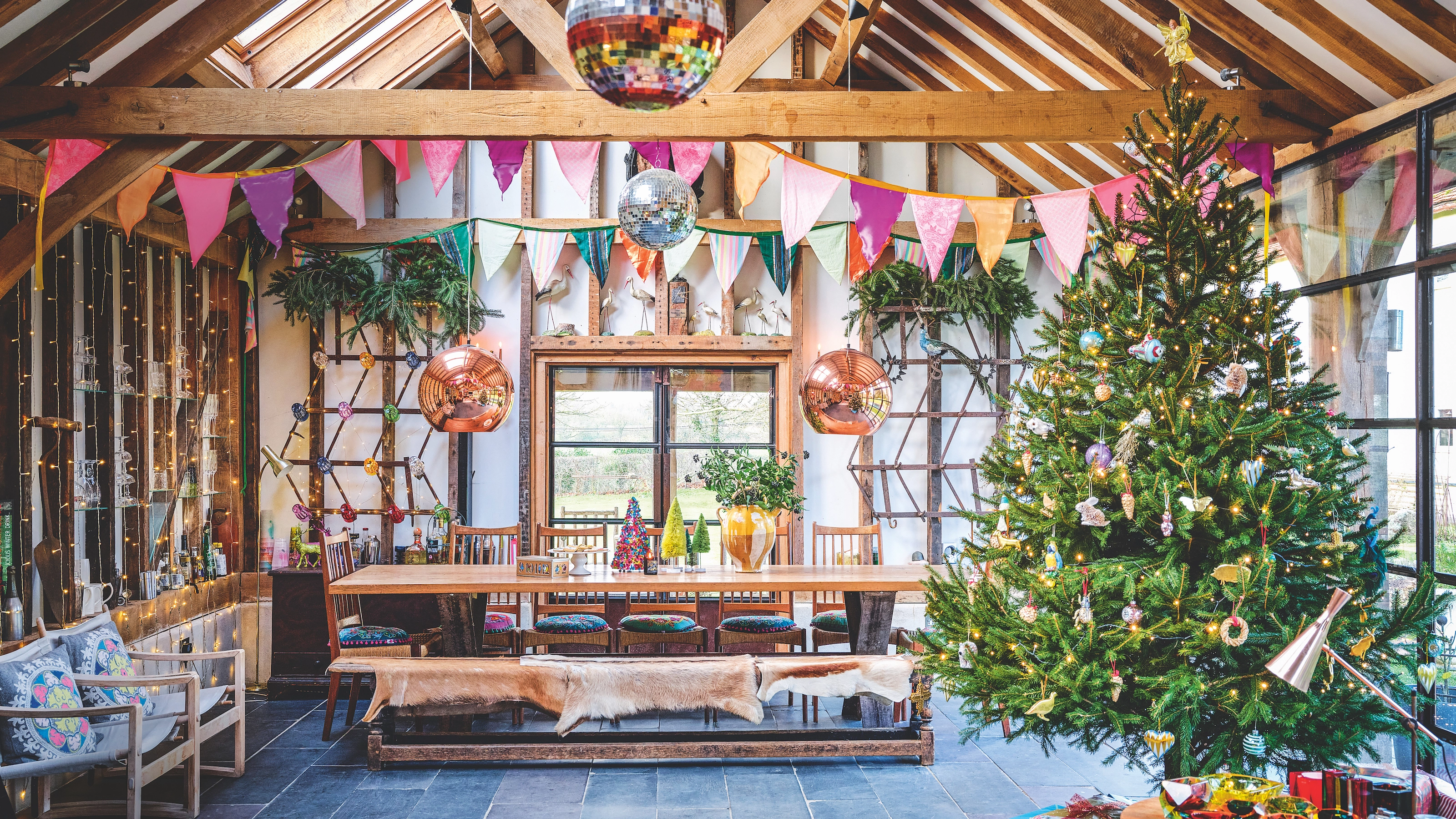 The room is decorated colourfully for Christmas, with tree decorations and table ornaments.