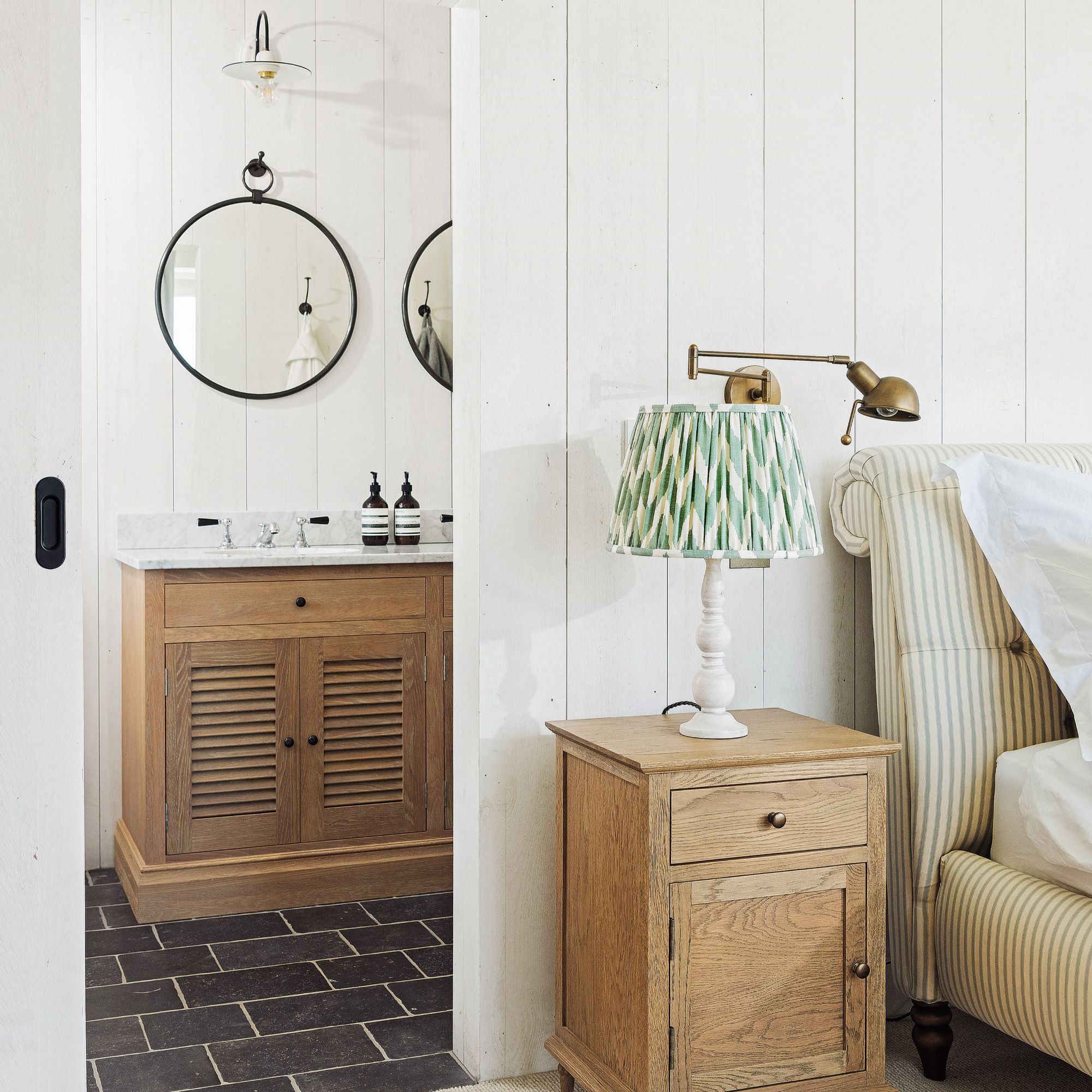 'The sliding door is a reclamation yard find that saves space as it doesn’t open inwards and means we can have a chest of drawer in front of it it. I like the fact that it’s made up of characterful planks, echoing the white-wash cladding and the ticking on the bed, and layering the stripes.’