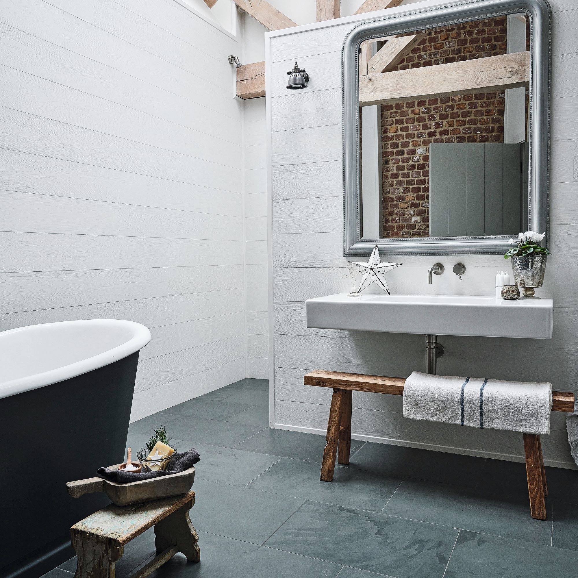 The minimal style continues in the bathroom, with plain walls which help features, such as wooden roof trusses and brickwork, to stand out. A monochrome bathroom palette also creates a soothing backdrop for a bathing space.