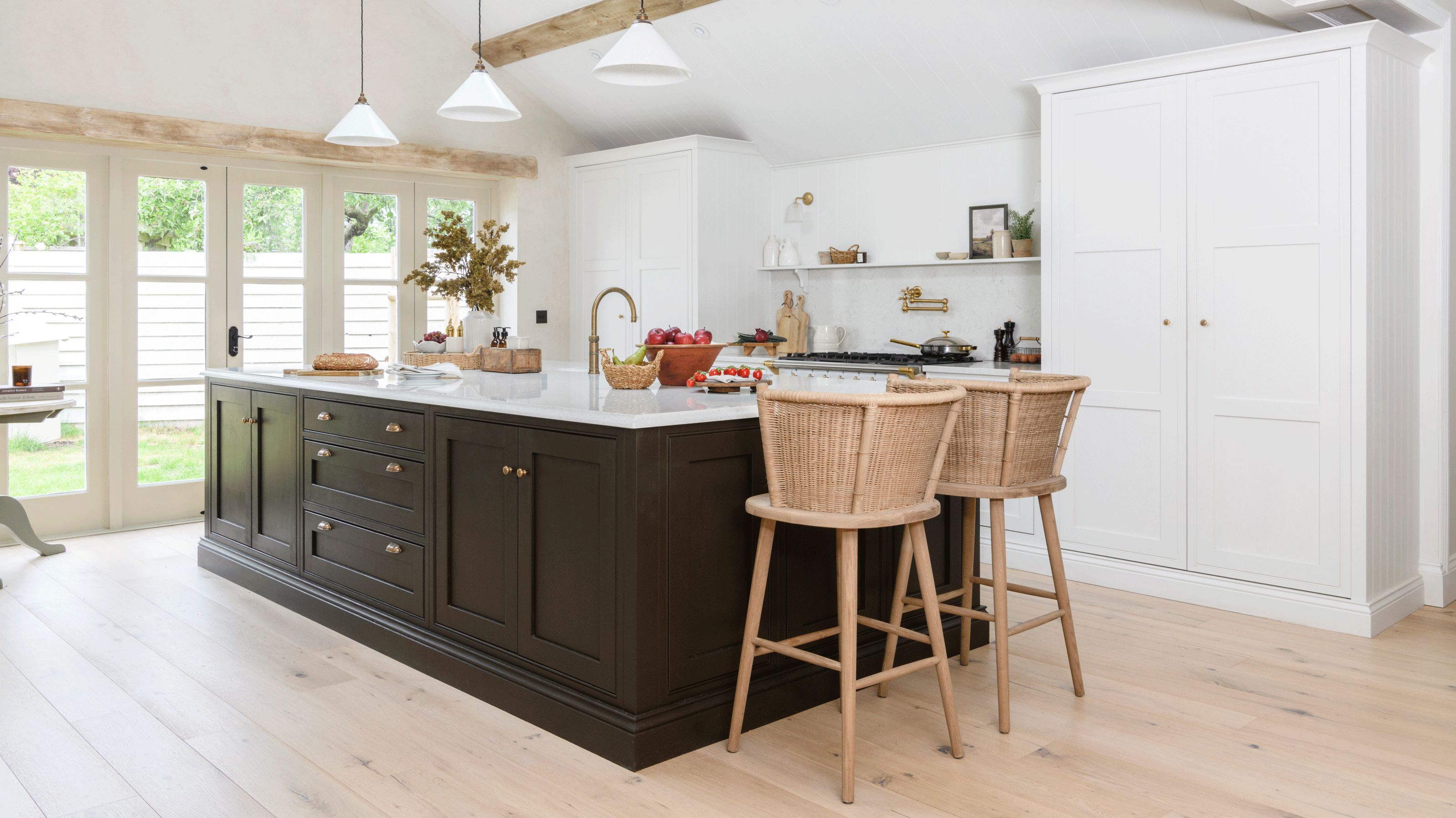 The central kitchen island has quickly become the heart of this home. Its quartz worktop with an ogee edge elevates the design, adding interest, and its soft colours tie in with the classic-meets-modern style. The oak beams are a new addition to add character.