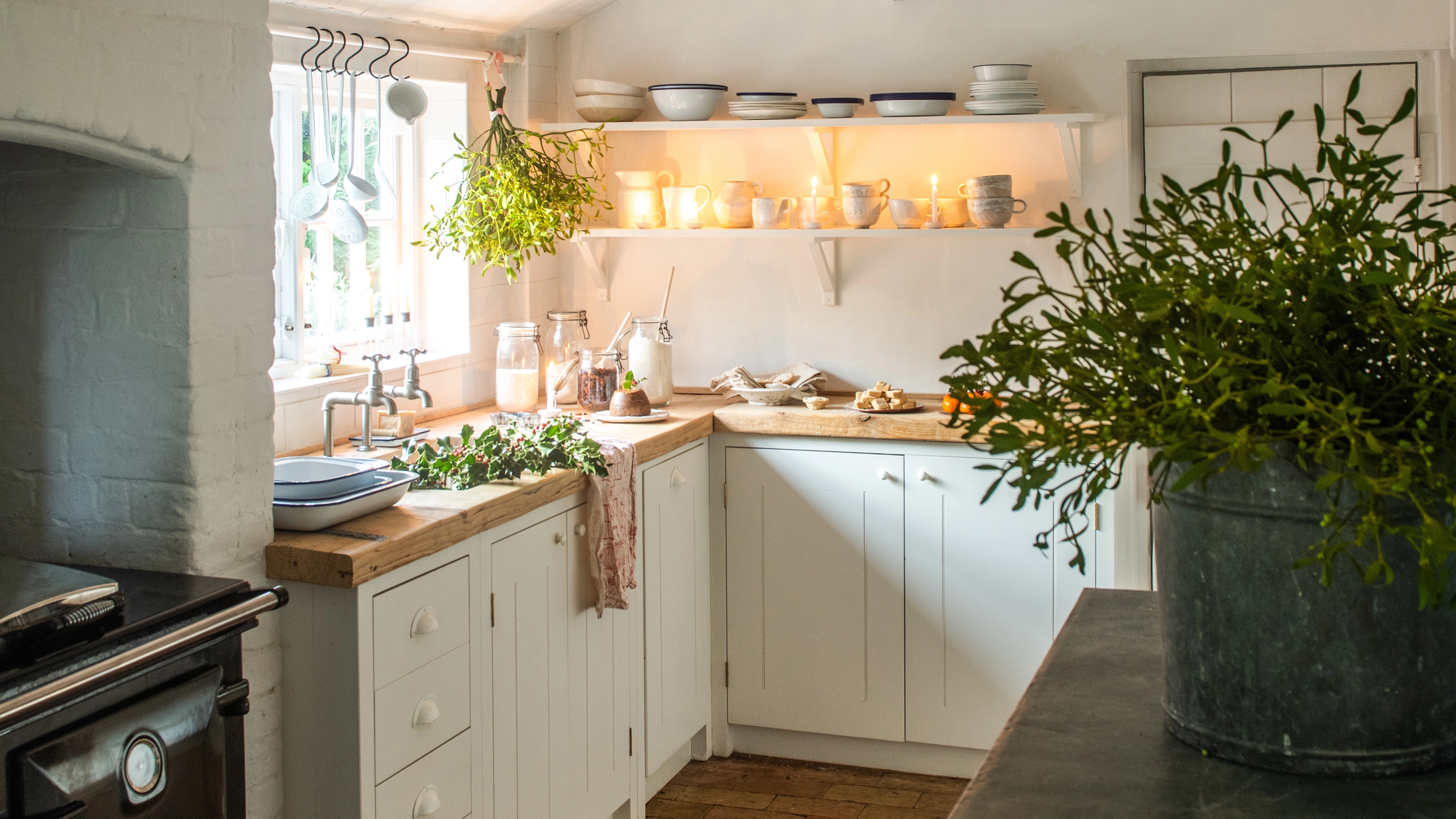 Now complete, the kitchen is an oasis of calm during the busy festive season. ‘We keep kitchen decorations to a minimum so that the worktops are free to prepare food, but we love to decorate our windows, shelves and doors with fresh-cut foliage and blooms,’ says Belle.