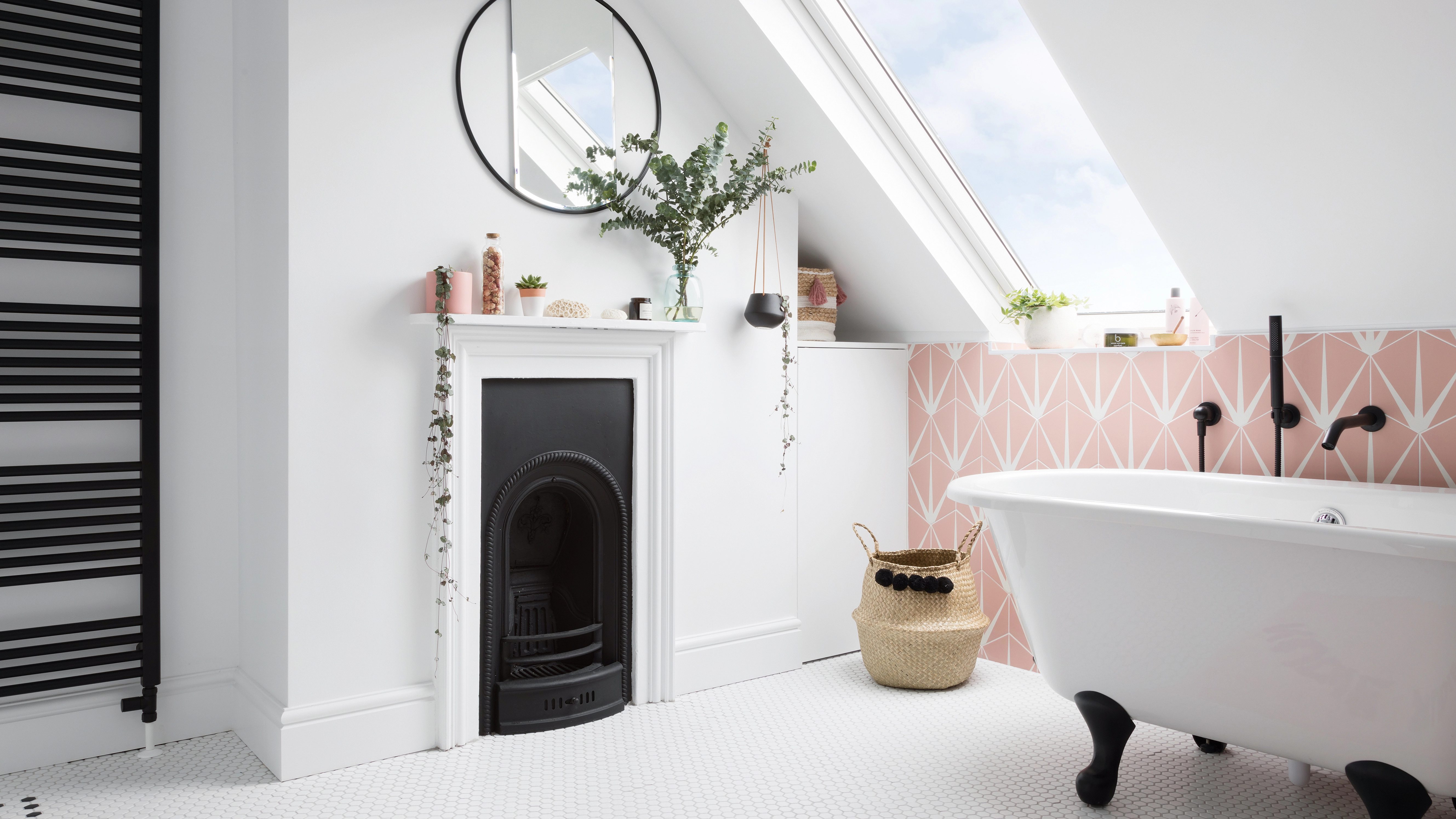 ‘We used the sloping roof to our advantage, fitting hidden storage cupboards into the eaves to minimise clutter.’ Lily Pad porcelain tiles in Bubblegum, £76.72sq m, Ca’Pietra. Seagrass pom-pom basket, £18.99, Robert Dyas, is a close match