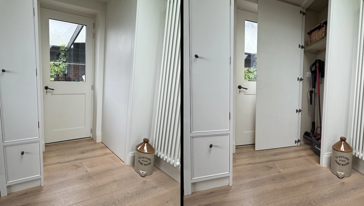 In the new layout, we spotted the perfect opportunity between the tall fridge-freezer and the back door – a narrow sliver of otherwise redundant space in the corner. Instead of panelling it off, my husband built a slim stud wall structure and transformed the void into a tall, full-height cupboard just deep enough for a cordless vacuum or two.