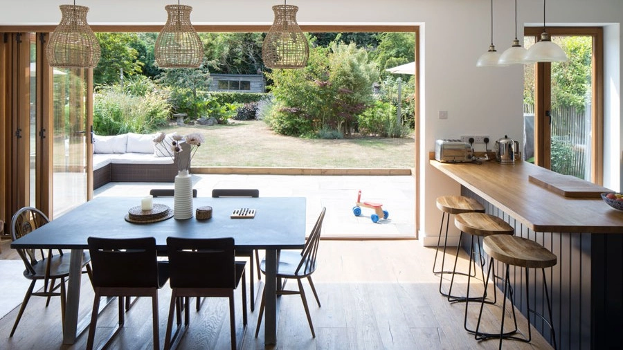 Now, the open-plan kitchen and dining room looks onto a beautiful, secluded garden and from mid-morning until sunset, sunshine streams into the space. The overall layout means they can all be under the same roof but still spread out if we need to have some space.