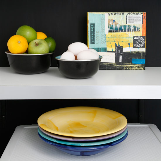To tie in with the gloss white kitchen units, Sue fitted a white floating shelf. It contrasts with the blackboard painted wall and is perfect for the fruit bowl and other bits and bobs.