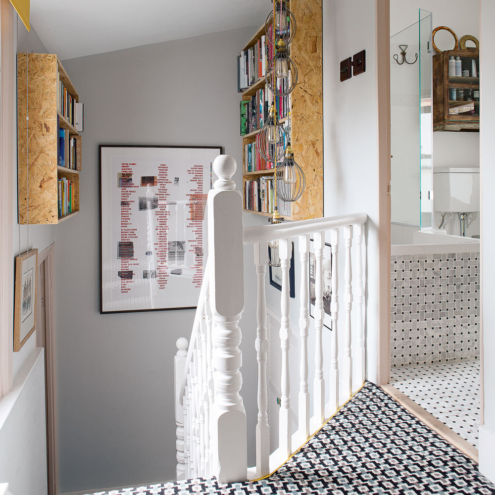 'I love the hall carpet. We decided not to have floorboards because of the children, so we really wanted to make the stairs look interesting.' The dark geometric carpet is a real talking point and practical for such a high-traffic area. Wall-mounted bookshelves make use of otherwise unused space, while a cluster of hanging pendants add to the eclectic, industrial vibe.