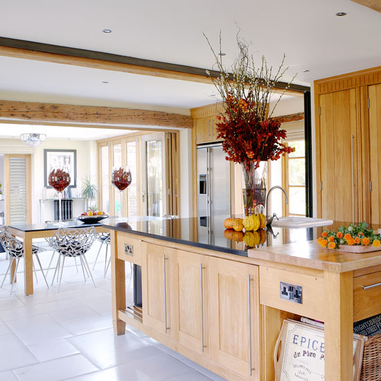 The smart open-plan kitchen, with its classic country style wooden units and island, is complemented by contemporary seating around a sleek kitchen table.