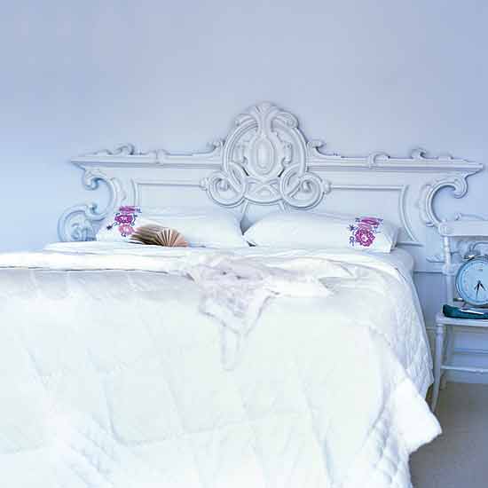 A tranquil retreat, the focal point in the bedroom is the white-painted pediment above the bed, which is from a chateau.