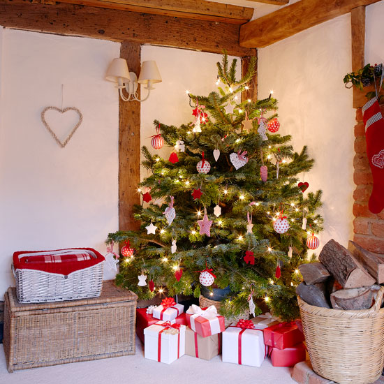 Whitewashed walls and wooden beams create a lovely spot for the welcoming Christmas tree.