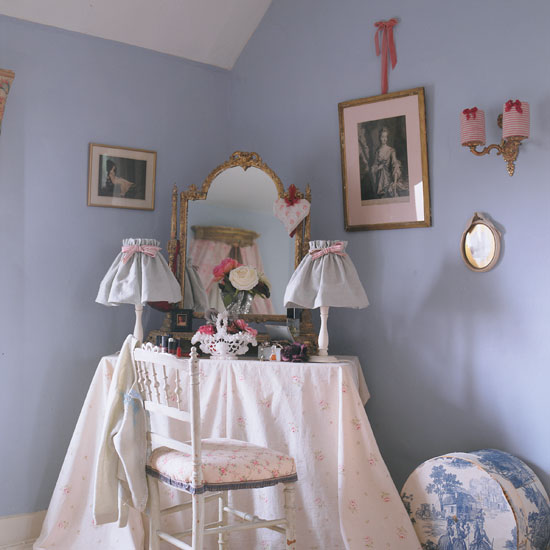 A pretty dressing area is created in the bedroom, with a simple tablecover and matching table lamps. Delicate drawings in simple frames tied with velvet ribbon add a feminine and delicate touch.