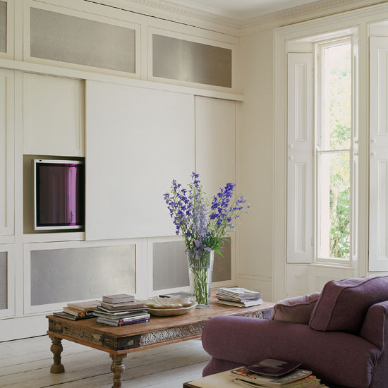 In this L-shaped living room, a plasma television screen fits neatly behind a sliding canvas panel. A purple sofa and carved coffee table warm up the neutral background.