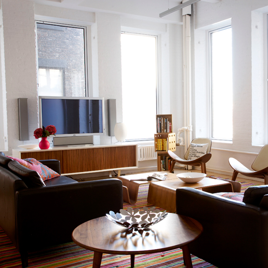 Light floods into the main living area of this New York loft apartment through 7 big windows. The rug, designed by Aronsons Floor Covering, was intended to add a feature that would tone in with the other colours featured in the rest of the house, as well as the earthiness of all the natural wood.