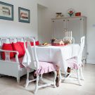 Pale-painted dining furniture gives the dining area traditional Swedish style.The red cushions on the bench complement the appliances in the kitchen.