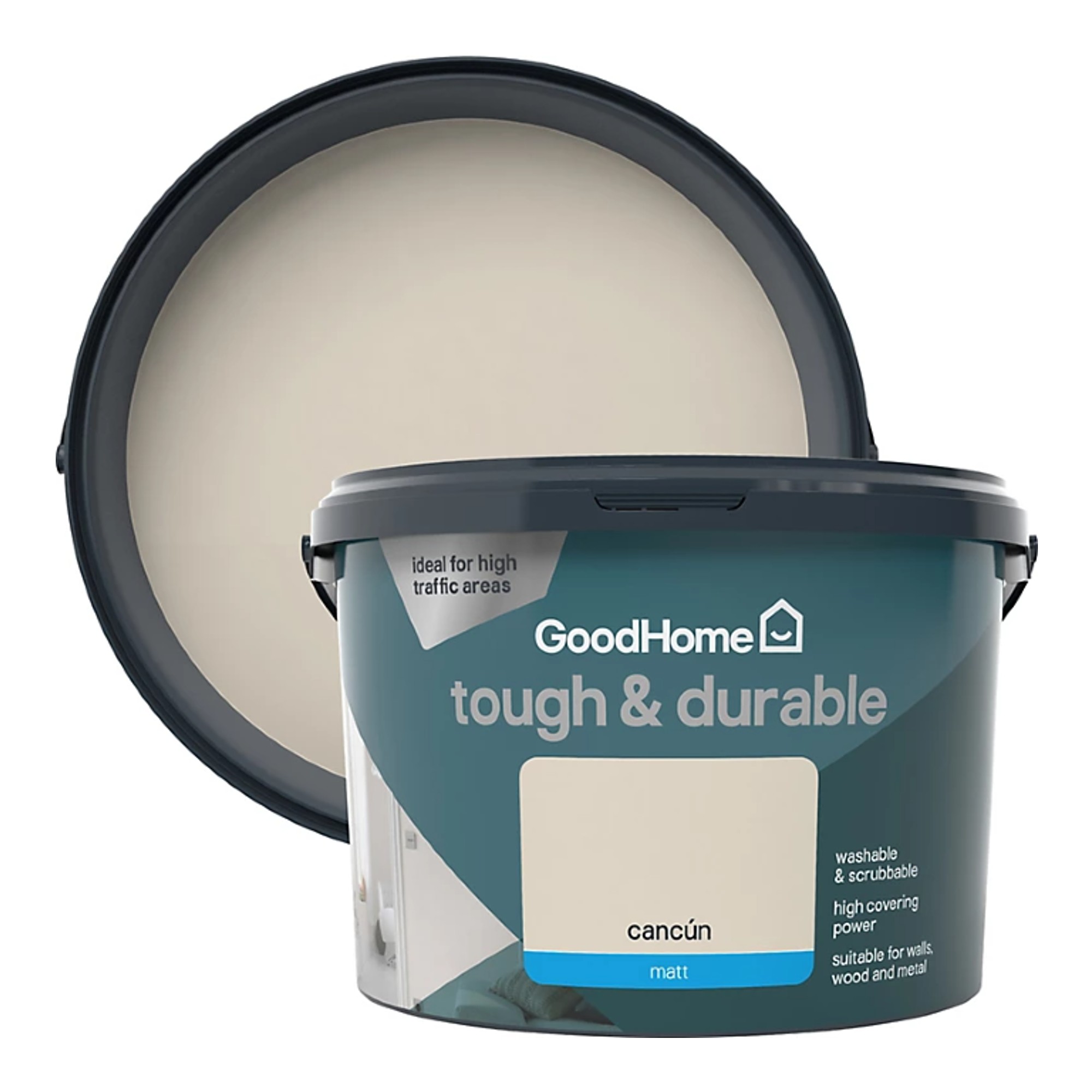 If you're on a budget but love the idea of greige walls, then GoodHome's Cancun matt paint is the perfect option for just £18 per 2.5L tin.