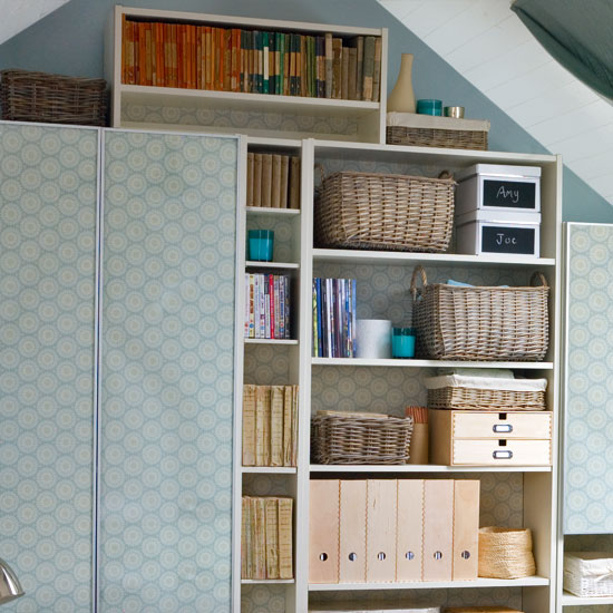 Make the most of the available storage space under sloping ceilings with an assortment of units in different heights. This style of bookcase, fits into an awkward space, making it a brilliant alternative to bespoke cupboards, and they're quick and easy to assemble. Customise the backs of shelves and glass cupboard doors with matching wallpaper for a co-ordinated look. Keep open shelves looking neat by storing clutter in these handy wicker baskets.