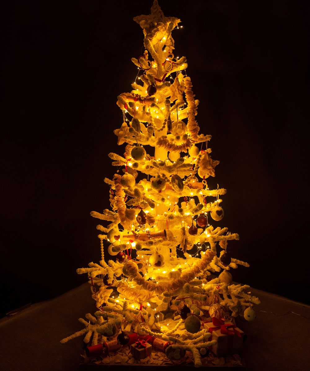 Adorned with 10 strings of crisp tinsel, 12 transparent crisp baubles and 40 onions the tree is an edible delight.