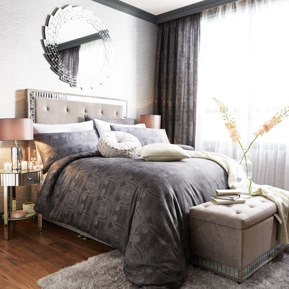 In addition to the soft furnishings, Michelle has launched some bold accent furniture. This uber-glitzy headboard (above) is just the thing to add a touch of vintage glamour to a dressed bed. The deep button-backed design is upholstered in on-trend soft grey fabric, and framed with chic bevelled mirror tiles. To complete the look there's a handy co-ordinating ottoman for storing all your extra throws and spare bedding sets.