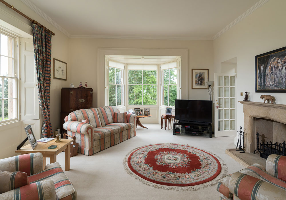 The light and airy dual aspect living room provides ample space for relaxing and entertaining. Cream carpets and walls have been jazzed up with the addition of country themed artwork, while a distinct striped sofa suit, circular Persian rug and bespoke Hamstone fireplace add interest.