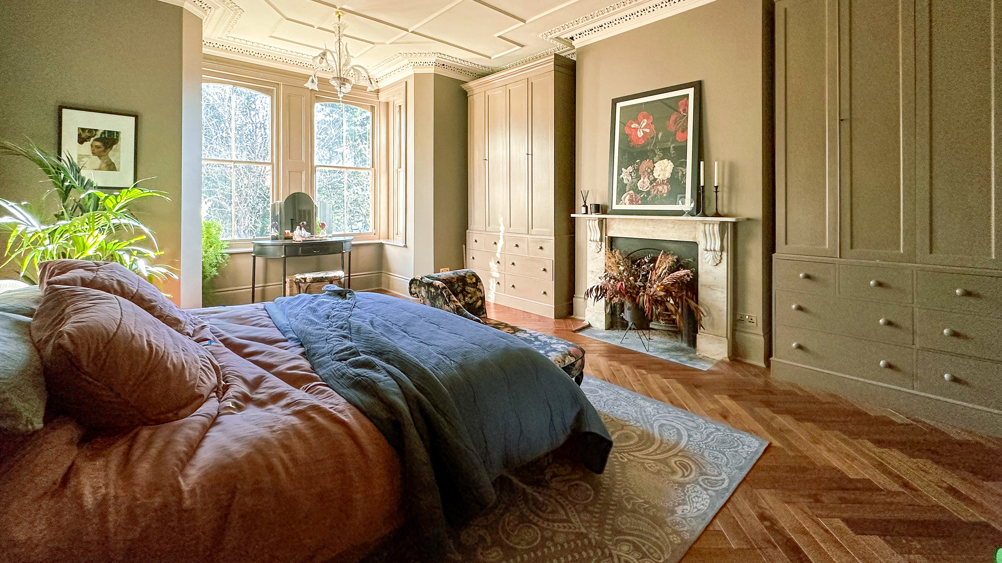 - Cohesion: To tie everything together, I went back to my interior design 101 essentials: Complimentary colour planning for flow through the whole primary suite, using Paint & Paper Library which offers a wonderful variety of tones. Our go-to Flooring Superstore Cambridge Bavarian Chevron engineered wood flooring throughout the whole apartment for structured warmth and rhythm. My favourite Corston Architectural for all hardware, lighting, and switches throughout - impeccable quality, subtly contemporary, stylishly respectful of the building’s period bones.