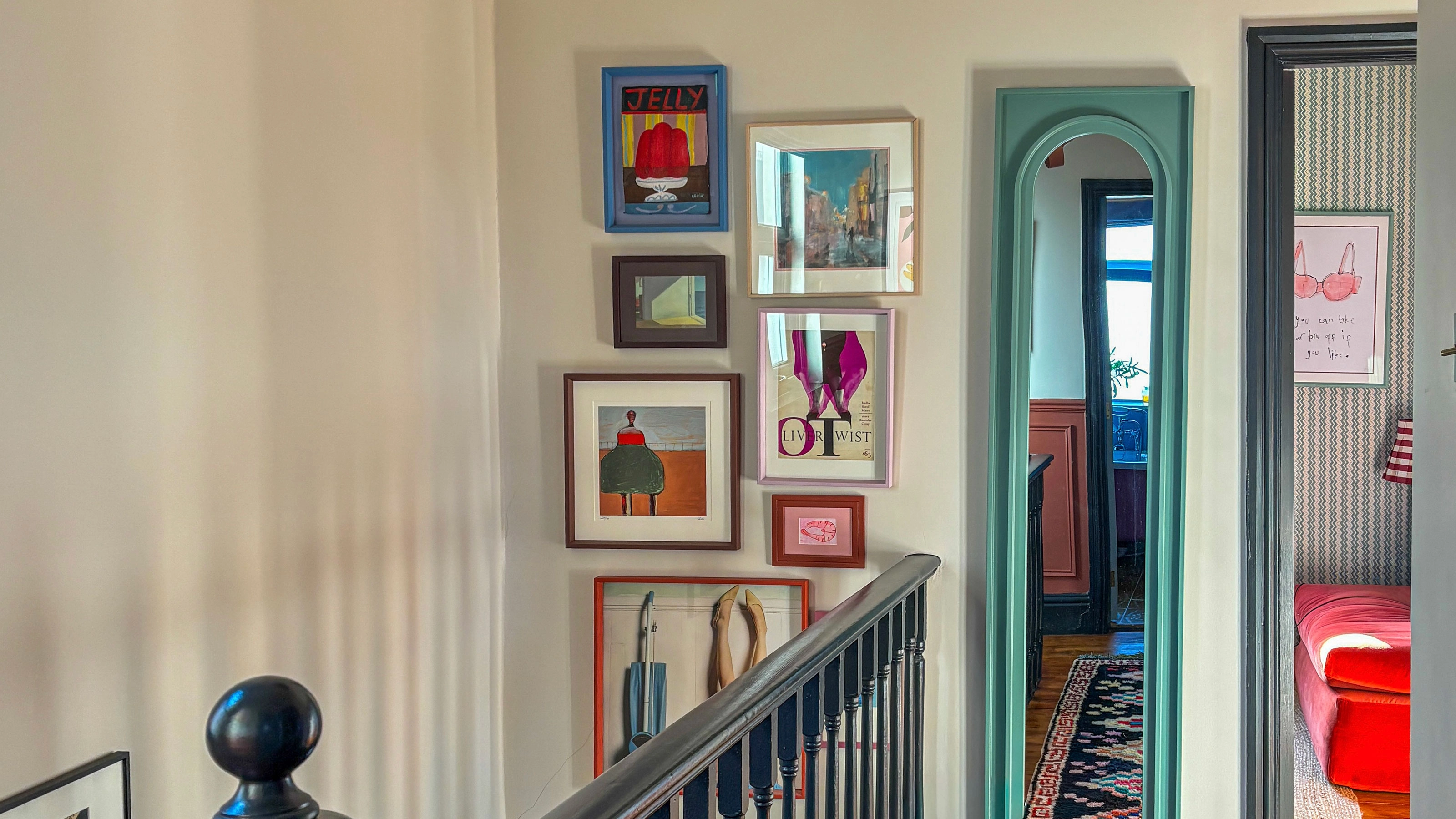 Upstairs: We ditched the red and took that same off-white from floor to ceiling. This keeps the light moving and makes the landing feel airy. I’ve introduced pops of blue in the mirror and a multi-coloured patterned runner to tie my (admittedly unfinished) gallery wall together.