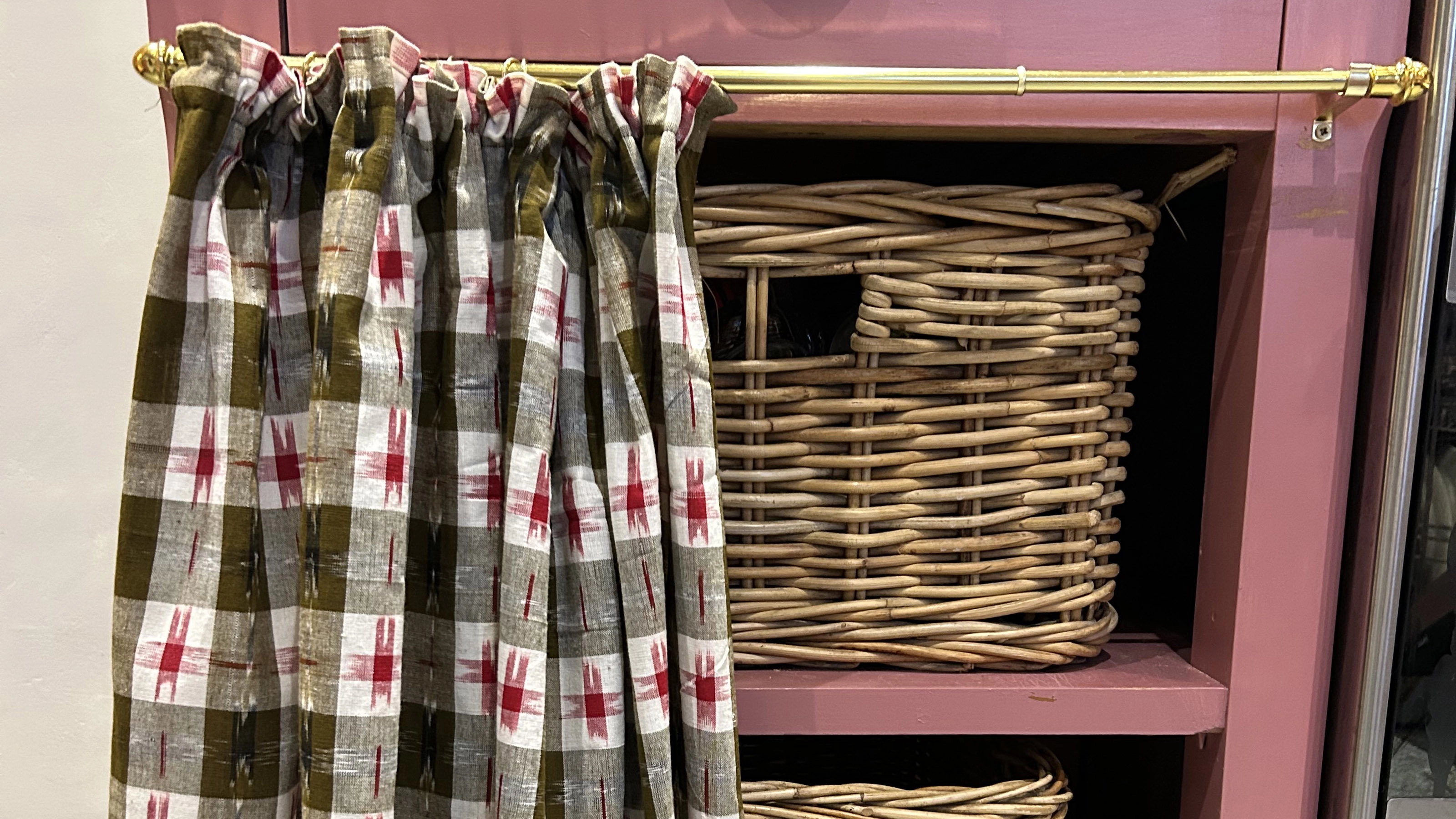 But what I really mean to talk about here are those colourful, rustic gingham or patterned curtains that are popping up under everyone’s kitchen counters and pantry shelves online. The kitchen skirt, if you will. I’m drawn to colour, and now that I’m firmly in my country era, I had to get on board.